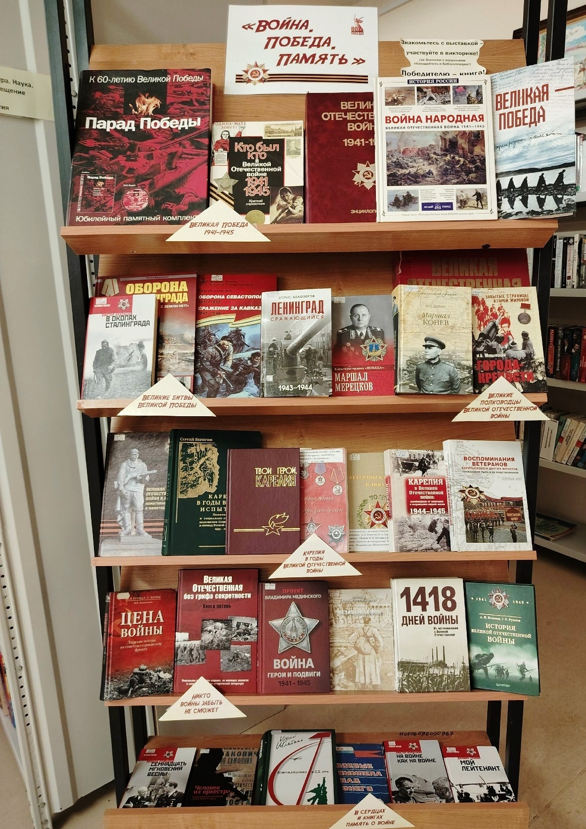 Экспозиция состоит из шести разделов: «Великая Победа 1941—1945», «Великие битвы Великой Победы», «Великие полководцы Великой Отечественной войны», «Карелия в годы Великой Отечественной войны», «Никто войны забыть не сможет», «В сердцах и книгах память о войне». В представленных изданиях читатели смогут найти информацию о начале и ходе Великой Отечественной войны, о великих сражениях на Курской дуге, под Москвой и Сталинградом, а также о выдающихся полководцах того времени. Посетители прочтут мемуары ветеранов Великой Отечественной войны, в том числе петрозаводчан, переживших блокаду Ленинграда, узнают о боевых подвигах жителей Карелии. Также на выставке представлена художественная литература о войне.