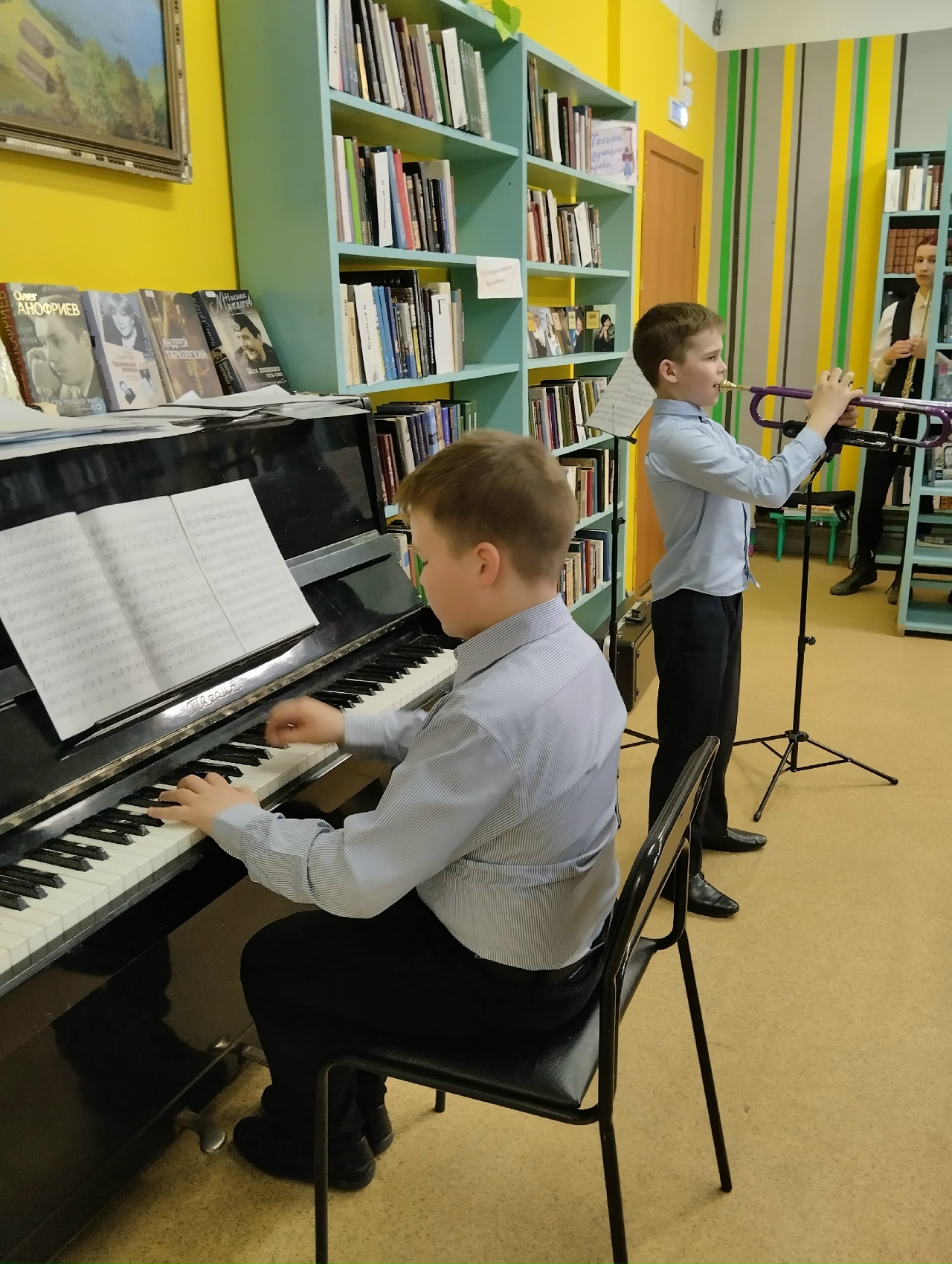 Трубач Василий и пианист Пётр сыграли вариации на тему французской народной песни и белорусский народный танец «Польку-Янку» в переложении Веры Милицкой. Поддержать своих друзей пришли учащиеся школы искусств.