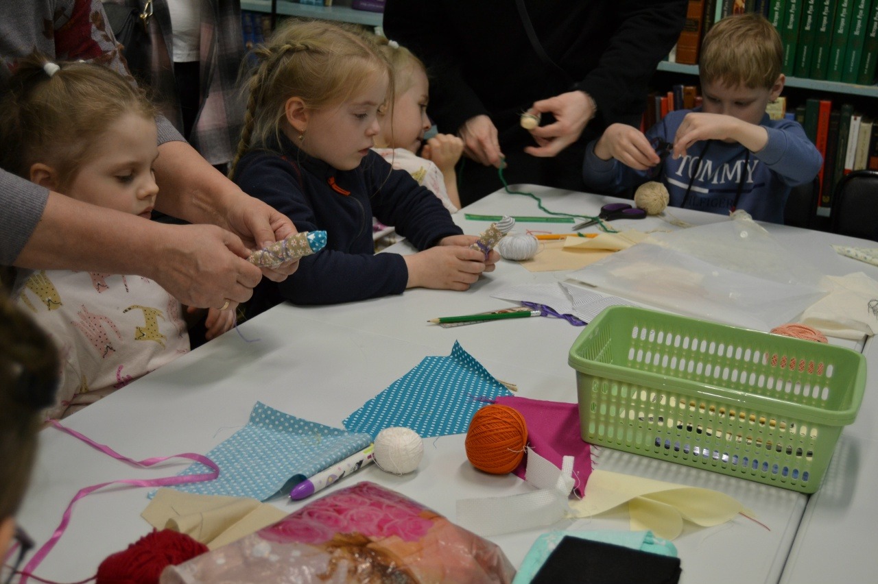 На мастер-классе «От лоскутка до оберега» дети с помощью родителей и библиотекаря Анастасии Строж мастерили куклу «Пеленашку». Они совершили путешествие в мир прошлого и познакомились с разными видами народных игрушек, их особенностями и узнали, почему в старину куколок делали без лица и часто из старых тканей.