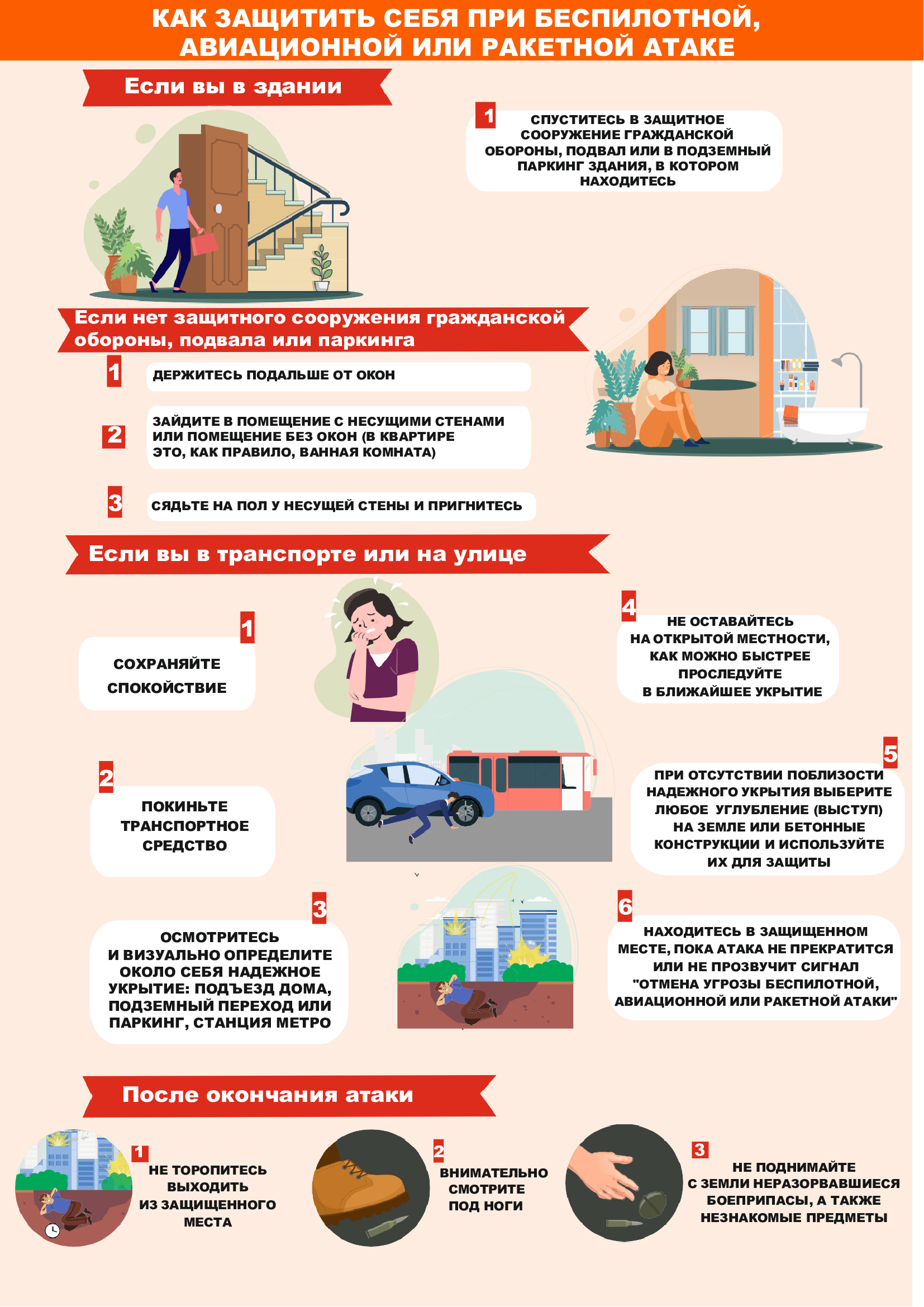 ♦ находитесь в защищённом месте, пока атака не прекратится или не прозвучит сигнал «Отмена угрозы беспилотной, авиационной или ракетной атаки».
