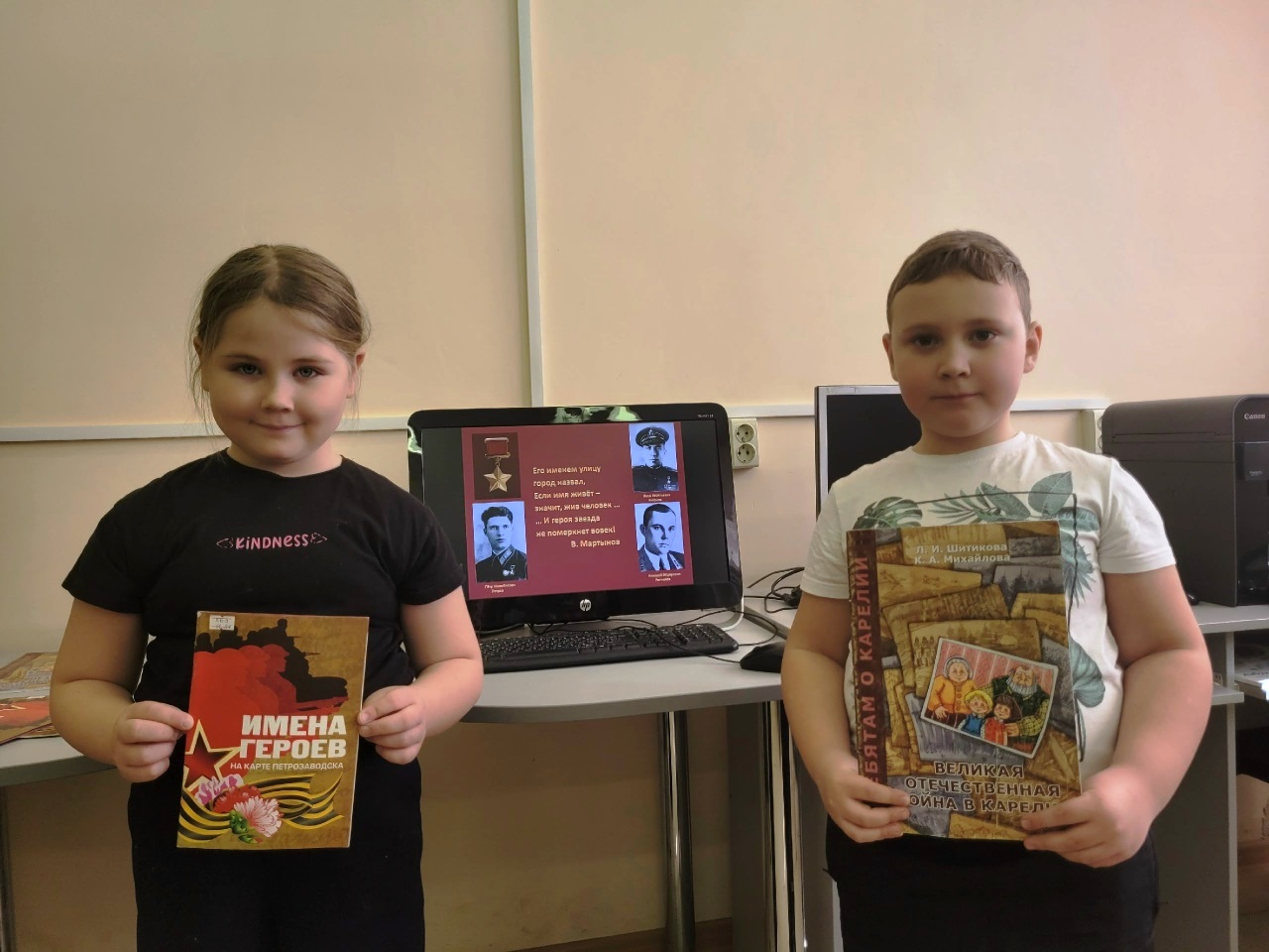 Для учащихся 6 «А» класса средней № 39 состоялись комментированные чтения книги Ю. Шлейкина, М. Гольденберга «Воинская слава Петрозаводска: события, факты, имена». Библиотекарь Светлана Петрова зачитала страницы из книги, познакомив ребят с фактами героической обороны столицы Карелии осенью 1941 года и подвигами его защитников. Она также обратила внимание на электронный ресурс МУ «Петрозаводская ЦБС» и показала три ролика из видеоцикла «Воинская слава Петрозаводска»: «Об эпохе Петра 1», «О Карельском фронте в годы Великой Отечественной войны», «Вечный огонь в Петрозаводске».