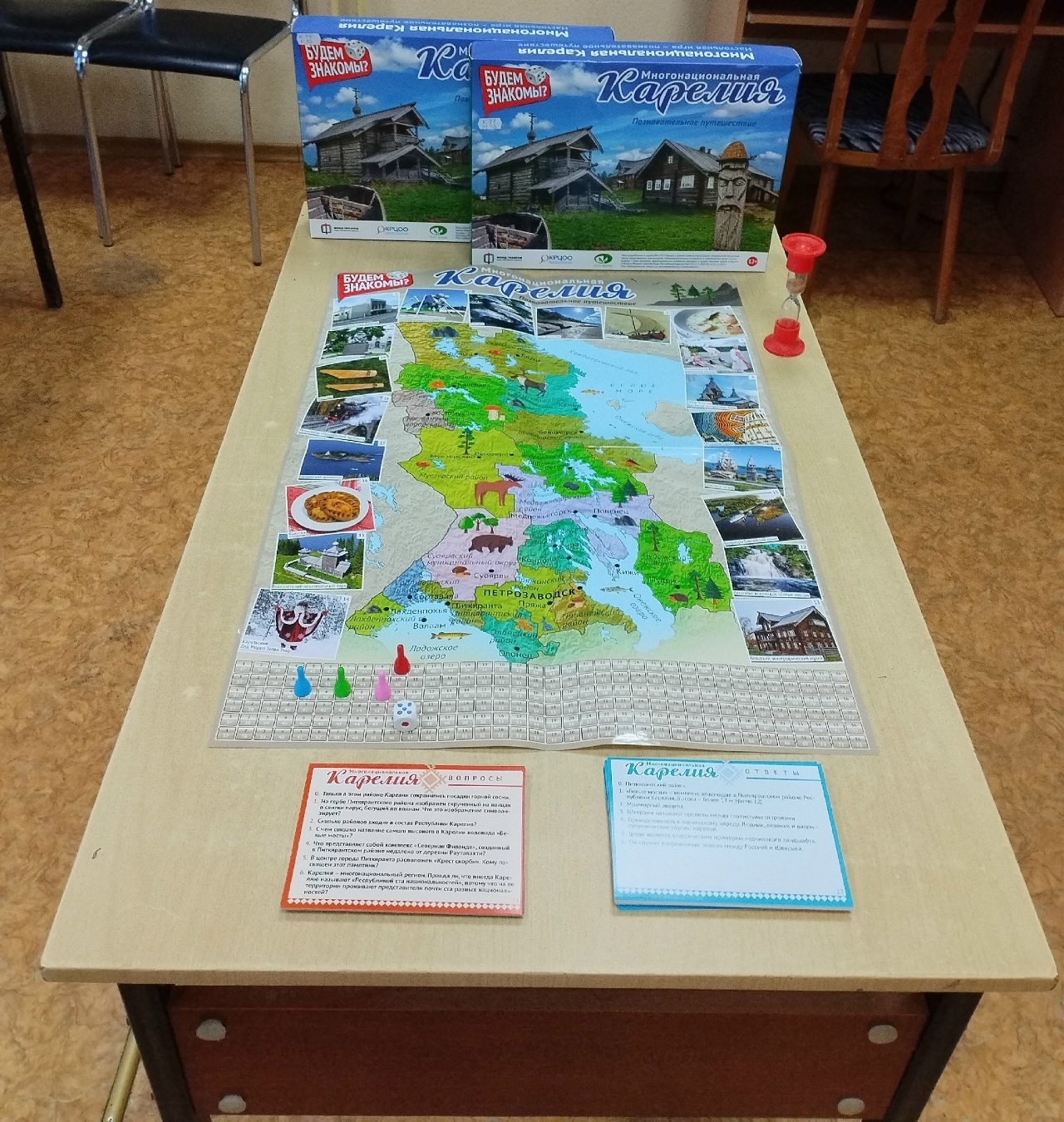Настольная игра «Многонациональная Карелия» была разработана и издана благотворительным фондом «СПС-фонд» в рамках проекта «Межнациональные отношения в современном мире: новые вызовы — пути решения». Участникам предстояло блеснуть эрудицией по истории и географии Карелии, узнать знаменитые памятники архитектуры и природы, вспомнить традиции и даже проявить кулинарную интуицию. Не обошлось и без вопросов о карело-финском эпосе «Калевала». Команды смогли ответить не на все вопросы, но ребята продемонстрировали искренний интерес к культуре и истории своей малой родины — прекрасной Карелии.
