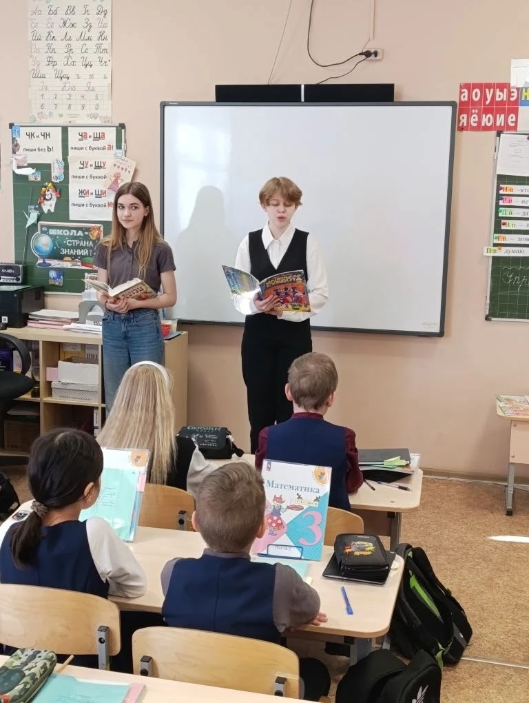 Произведения для детей любимых писателей Ирины Никитиной и Владимира Степанова прозвучали в этот день в средней школе № 27 для учеников 3 "Б" и 3 "В" классов в исполнении студенток Карельского колледжа культуры и искусств им. Героя Советского Союза Анны Лисицыной.