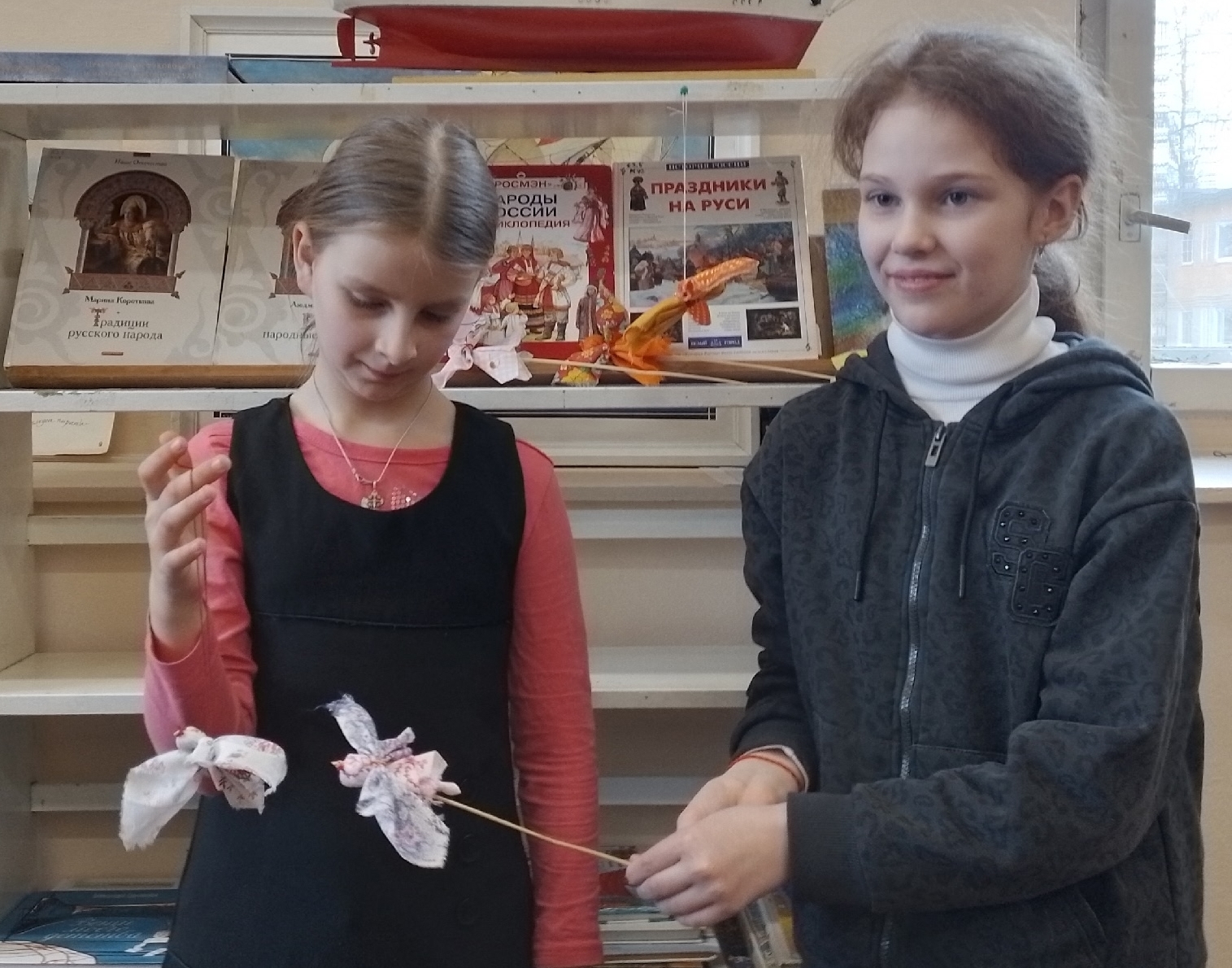 Весна подсказала ещё одну тему для встреч на Неделе детской книги – "Традиционные народные праздники и весенние традиции". В разных уголках нашей огромной страны сложились свои интересные традиции отмечать и праздновать приход весны. Этому были посвящены две встречи, одна из них прошла в читательском клубе «Мастерская радости».