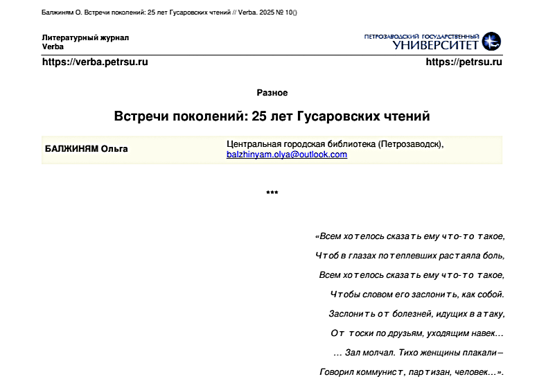 «Летопись» прошедших 25 Гусаровских чтений представлена в журнале «VERBA». Это издание рассчитано на всех интересующихся отечественной словесностью. Проект реализуется совместно с Союзом российских писателей по программе поддержки молодых авторов. На страницах юбилейного номера опубликована статья Ольги Балжиням, заведующего отделом обслуживания Центральной городской библиотеки им. Д, Я. Гусарова.