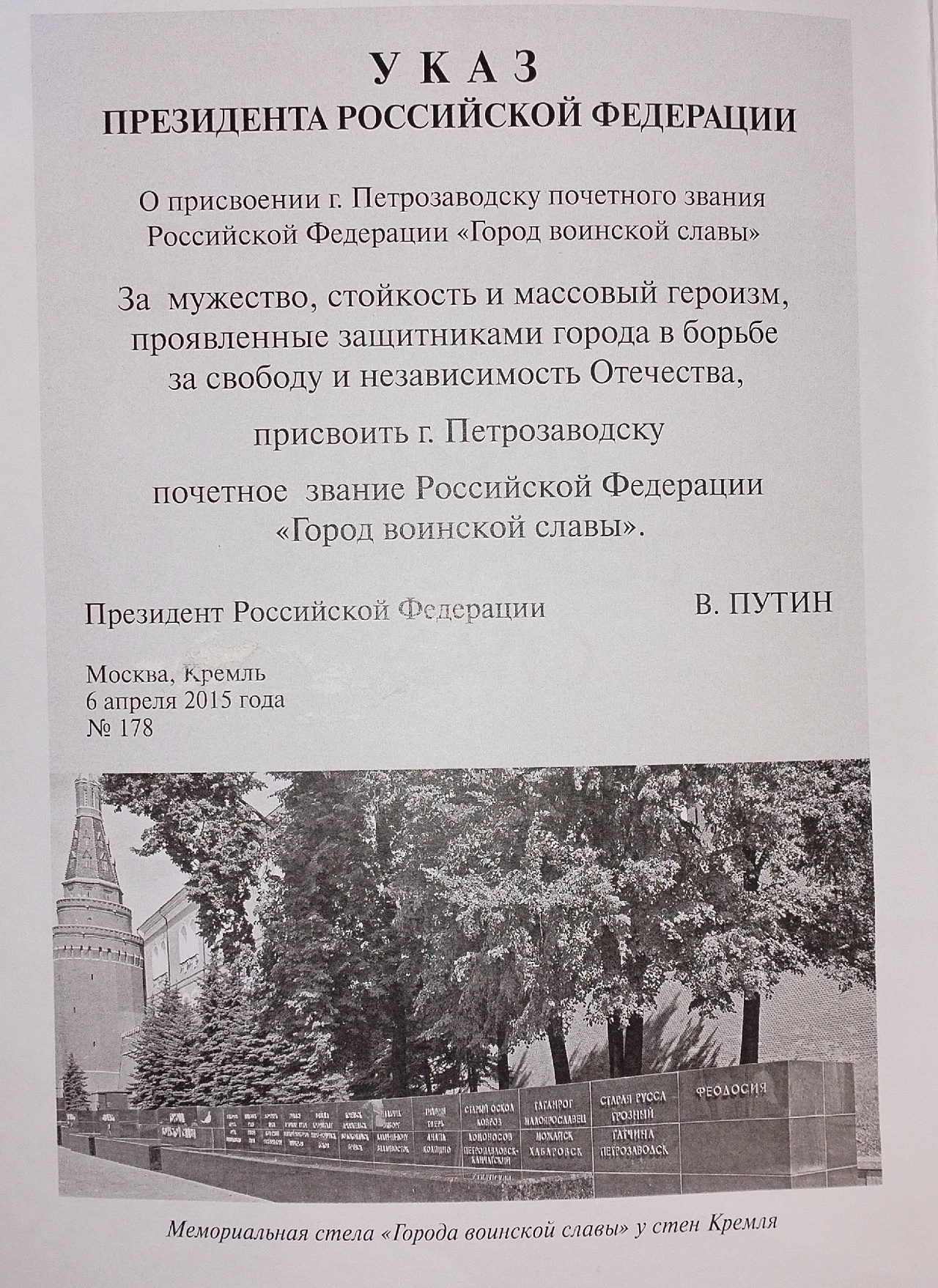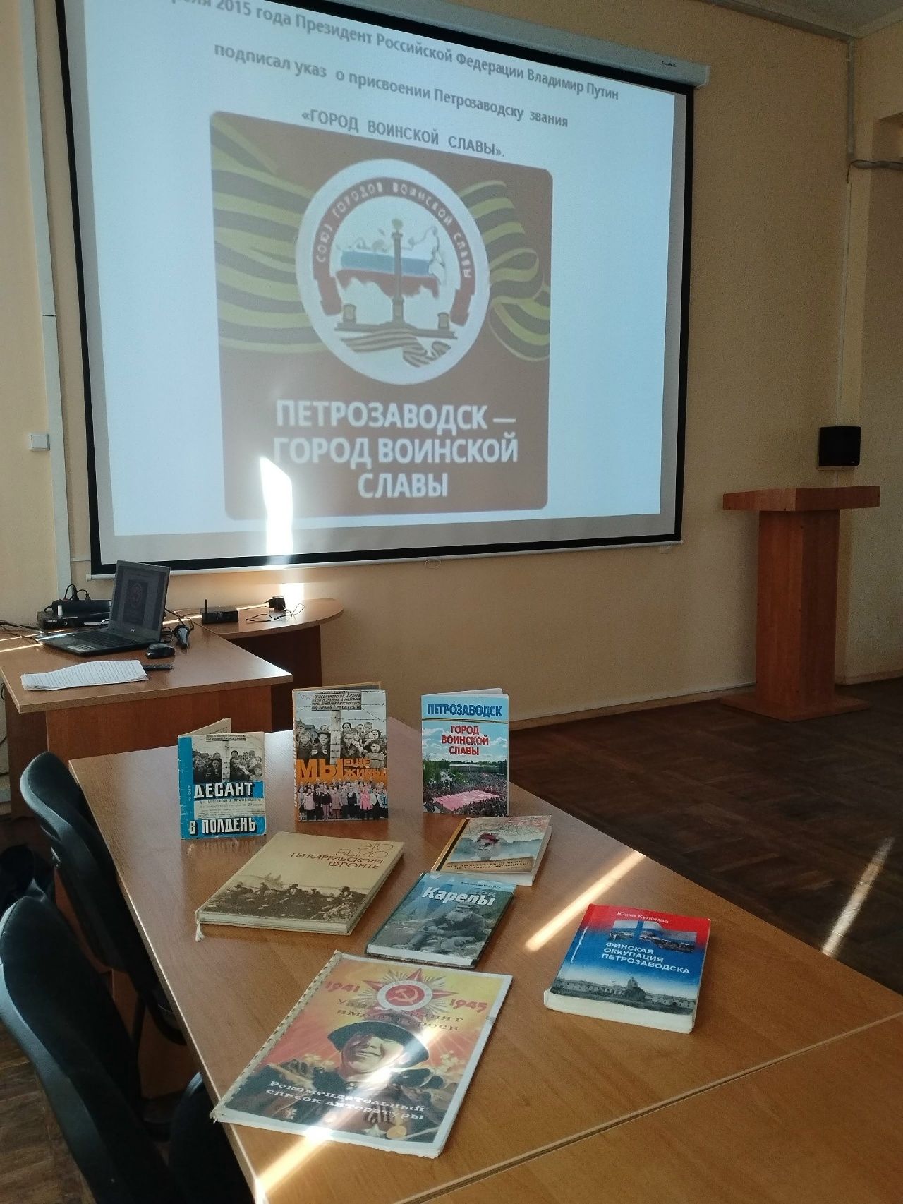 В течение апреля в Библиотеке им. Н. Клюева провели уроки памяти «Петрозаводск в годы войны» для учащихся четырёх образовательных учреждений карельской столицы: студентов Петрозаводского лесотехнического техникума и Колледжа технологии и предпринимательства, а также для учеников старших классов средней школы № 5 им. генерала В. А. Фролова и средней школы № 34. Мероприятия были приурочены к годовщине присвоения Петрозаводску почетного звания «Город воинской славы». Такое высокое звание даётся городам за «мужество, стойкость и массовый героизм, проявленные защитниками города в борьбе за свободу и независимость Отечества» (из указа президента РФ от 6 апреля 20215года).