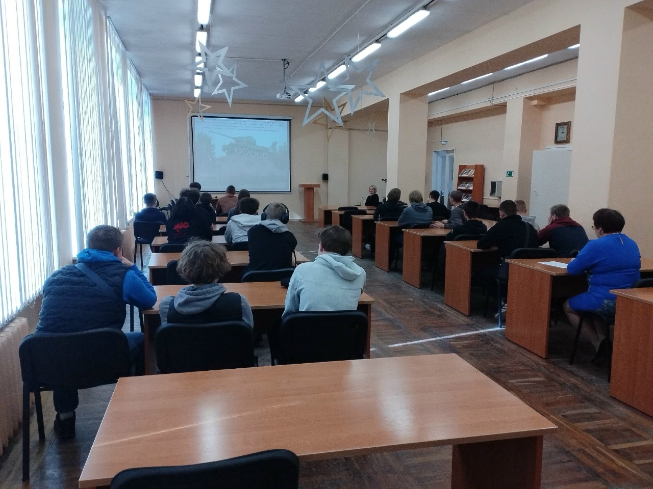 Библиотекари рассказали слушателям о героизме солдат Красной армии, десантников Онежской военной флотилии и партизан при освобождении города и узников фашистских концентрационных лагерей, о военно-мемориальных комплексах в Петрозаводске в честь увековечения памяти и бессмертного подвига советских воинов, погибших при защите нашей страны. Молодёжи было также представлено большое количество книг из фондов библиотеки на тему финской оккупации Петрозаводска с 1941 по 1944 годы.