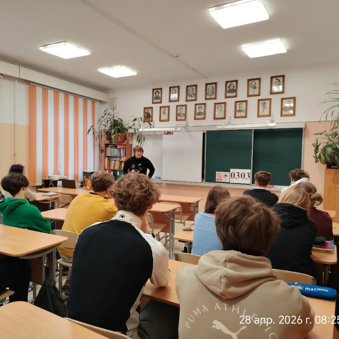 28 апреля 2026 года ученики 10 «А» класса Ломоносовской гимназии встретились с известным карельским музыкантом и журналистом Никитой Власовым. Интересную встречу организовала Центральная городская детская библиотека им. В. М. Данилова (ул. Гоголя, д. 14).