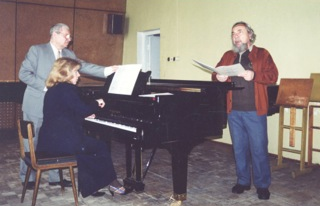 (Р. Зелинский на репетиции «Избяных песен» в Малом зале Петрозаводской консерватории с исполнителями В. Каликиным и С. Синцовой)