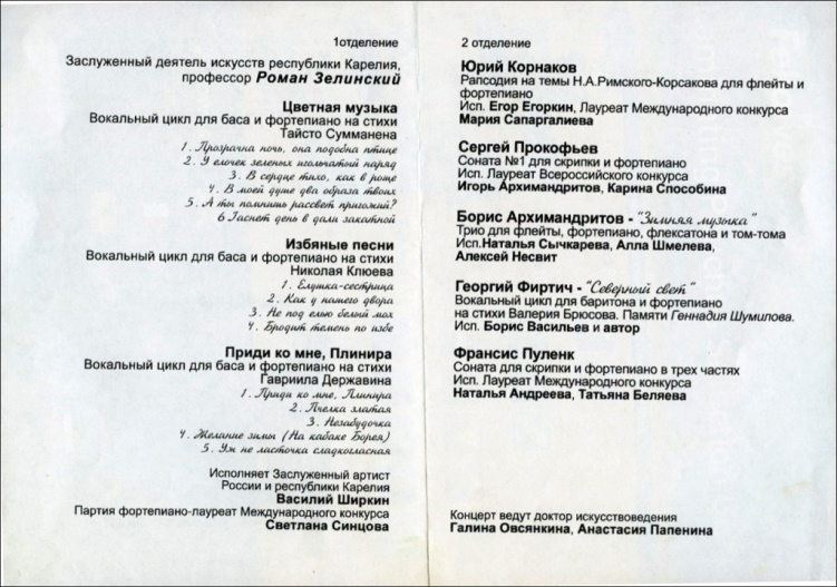 Время распорядилось так, что нашим последним совместным концертным выступлением с Виктором Каликиным в Петрозаводской библиотеке года стал вокальный цикл Романа Зелинского «Избяные песни», исполненный 15 апреля 2007, в день присвоения филиалу ЦБС № 3 имени русского поэта Николая Клюева.