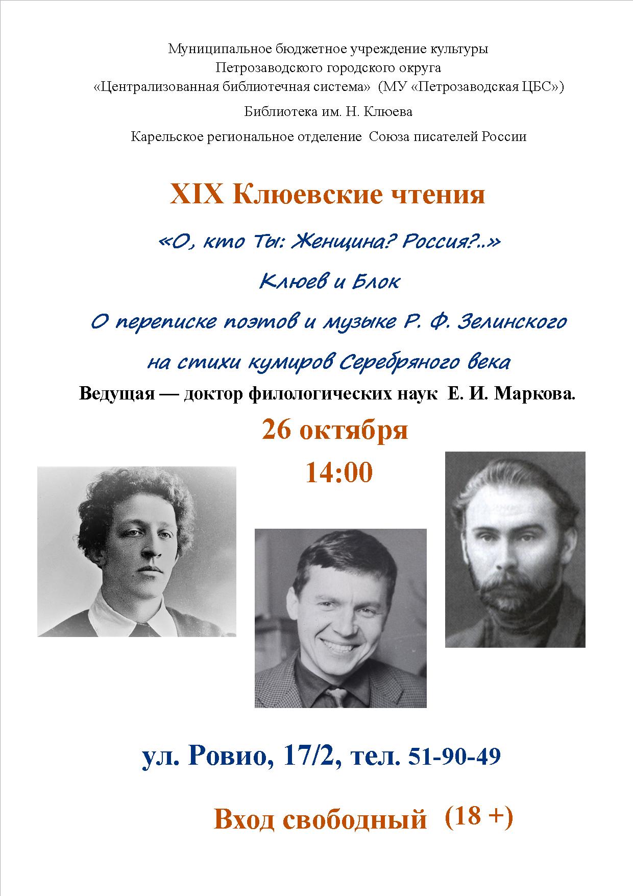 «О, кто Ты: Женщина? Россия?..» Клюев и Блок. О переписке поэтов и музыке Р. Ф. Зелинского на стихи кумиров Серебряного века» — тема Клюевских чтений этого сезона. Бессменной ведущей Клюевских чтений является Елена Ивановна Маркова, учёный с мировым именем, доктор филологических наук, один из самых авторитетных исследователей творчества Николая Клюева, член Союза писателей России.