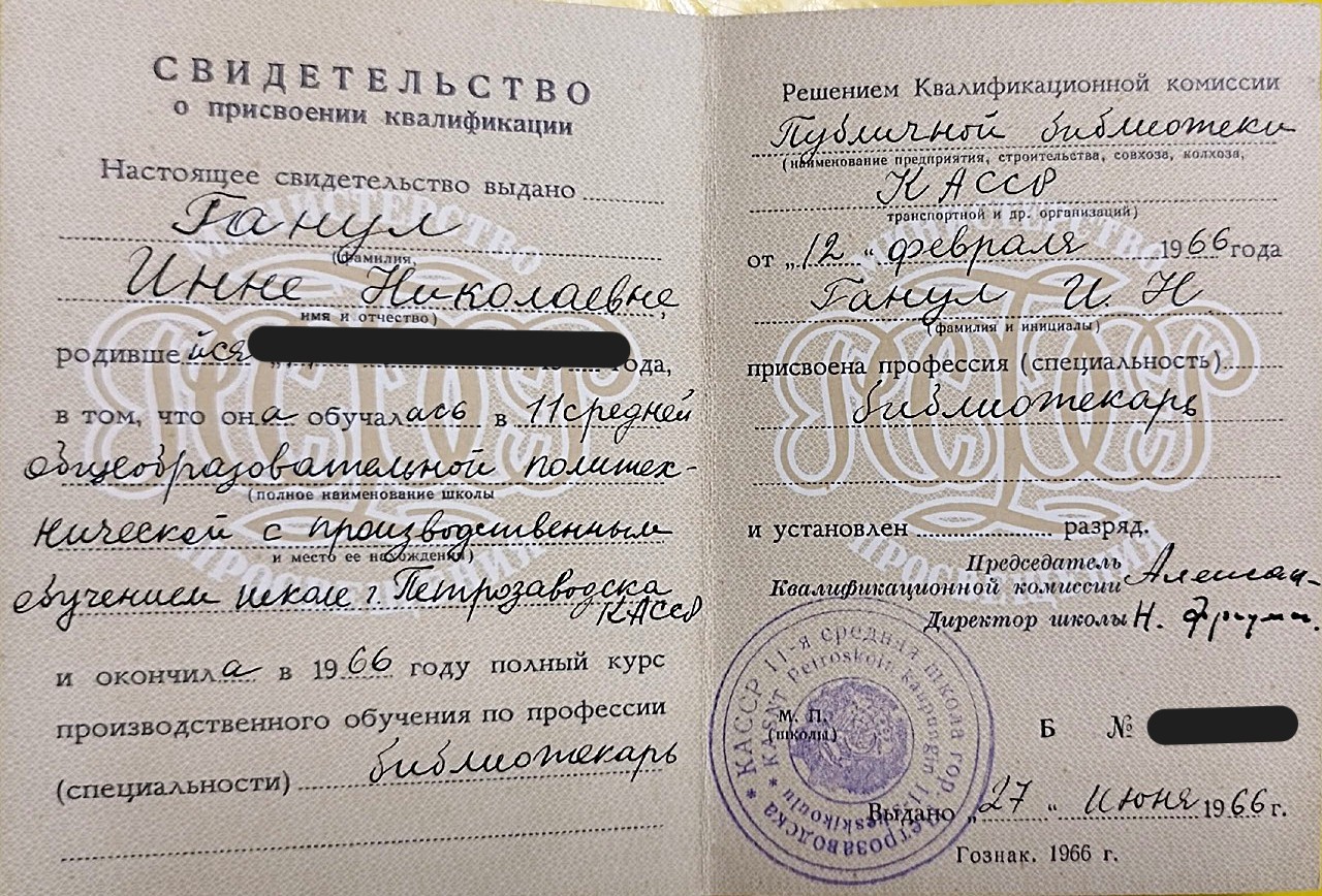 «У нас было много разных событий в библиотеке: спектакли, праздники, карнавалы. Раньше мы часто ходили в библиотеки, потому что книг не хватало. Сидели в читальном зале, – вспоминает наша героиня. – Когда я окончила 8 классов в Сортавале, там было несколько предложений по освоению какого-то профессионального направления. Тогда школа была не 10-летней, а 11-летней за счёт того, что каждый выпускник школы получал ещё и профессию. Я с радостью пошла на библиотечное отделение. Когда мы переехали в Петрозаводск, продолжить это направление получилось в средней школе № 11, которую я в 1966 году окончила. Имею квалификацию библиотекаря. Нас очень серьёзно готовили. Мы по месяцу работали в библиотеке в 1964 и 1965 году. Нам доверяли работу в читальном зале и на абонементе».