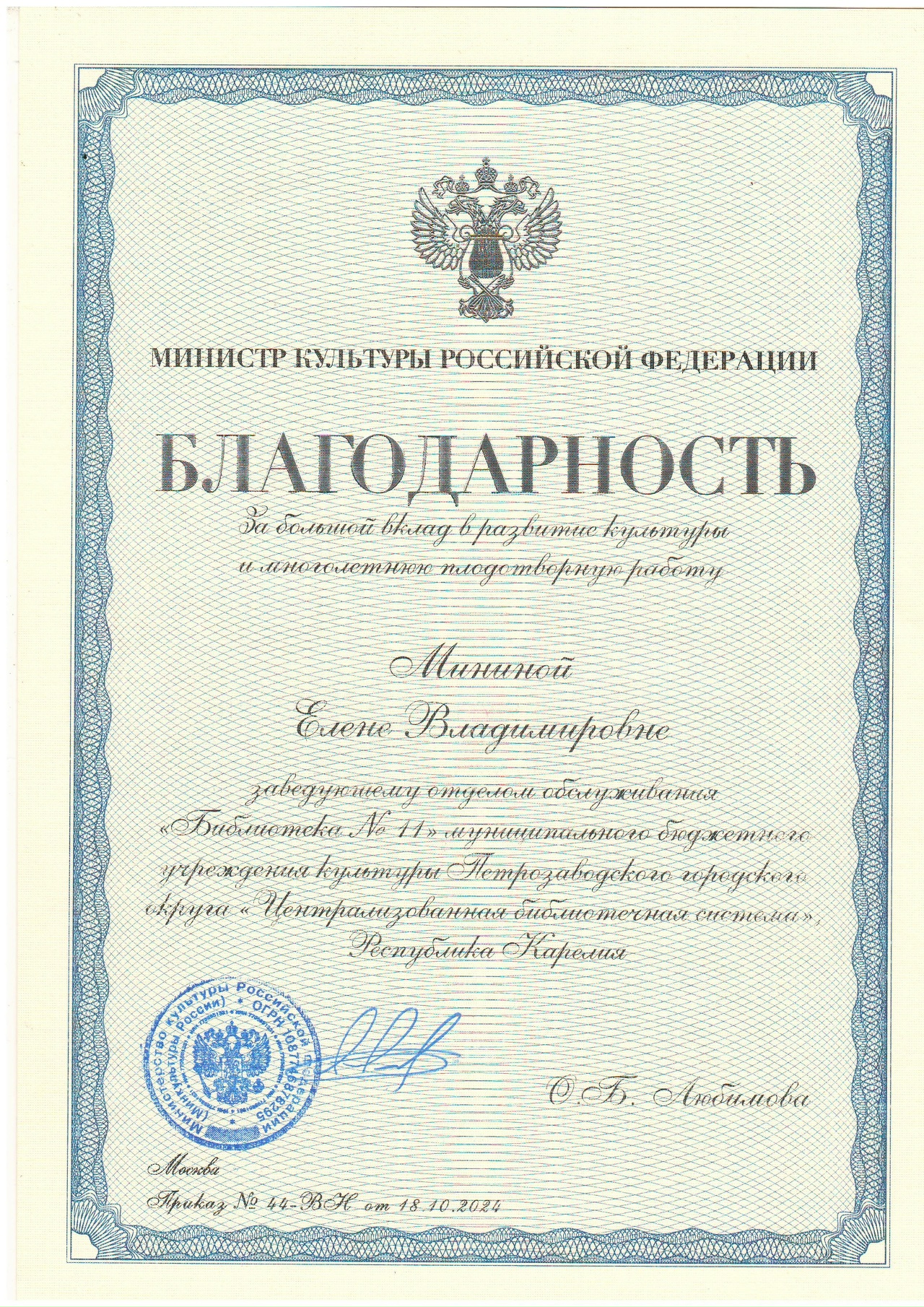 И это не единственная награда. В 2024 году Елене Владимировне передали от министра культуры России Ольги Любимовой письменную благодарность за большой вклад в развитие культуры и многолетнюю плодотворную работу. И в том же году Министерство природных ресурсов и экологии Республики Карелия вручило ей почётную грамоту за вклад в экологическое воспитание и формирование экологической культуры населения.