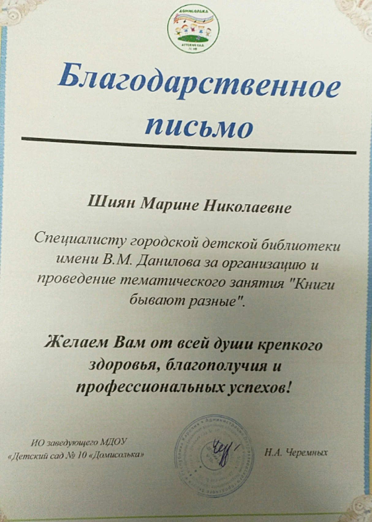 Сотрудники детского сада № 10 "Домисолька" вручили библиотекарю благодарственное письмо. "От всей души благодарим Марину Николаевну за чудесное занятие, за то, что помогли нашим детям открыть для себя волшебный мир книг", – написали они в группе своего дошкольного учреждения в соцсети "ВКонтакте".
