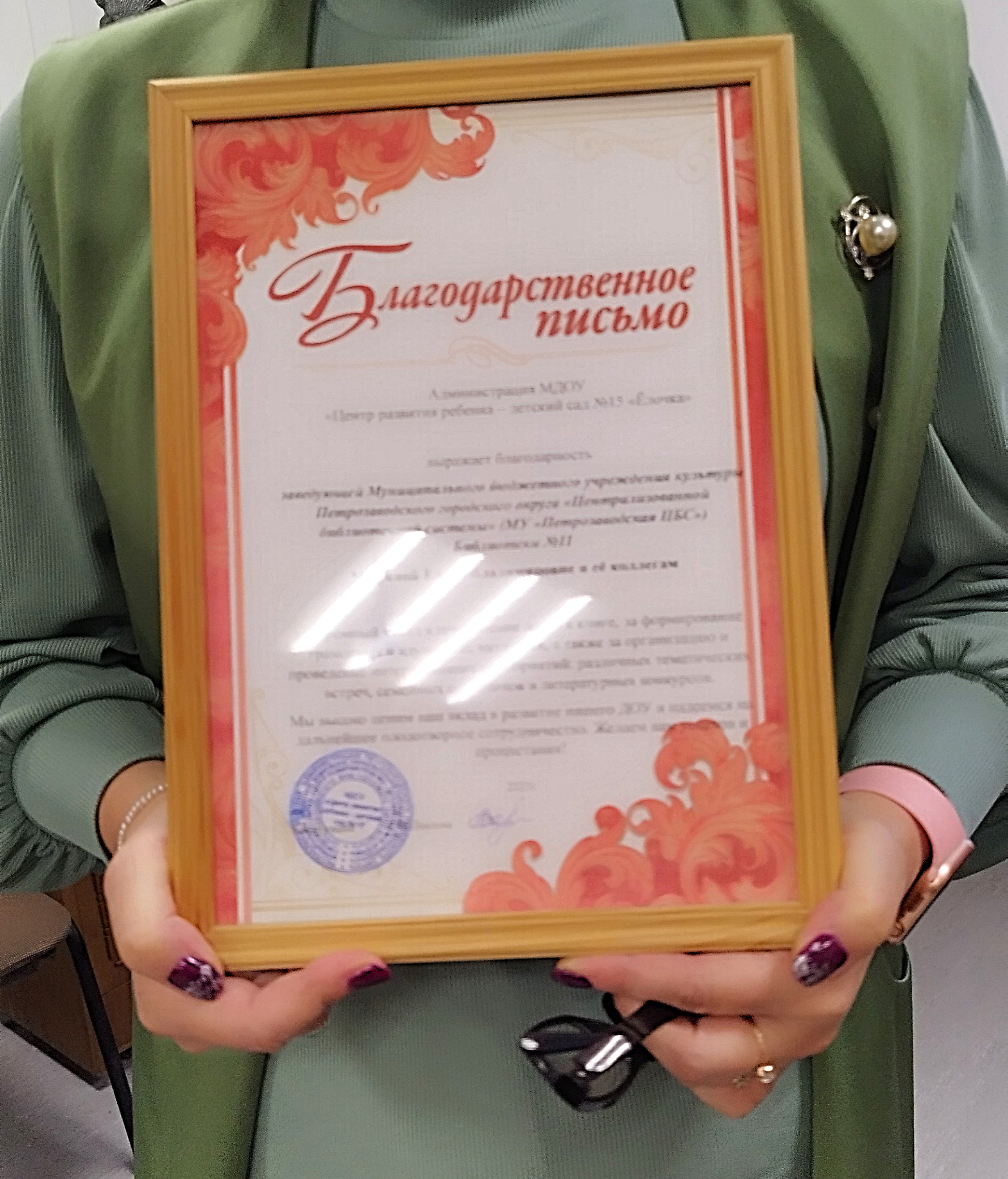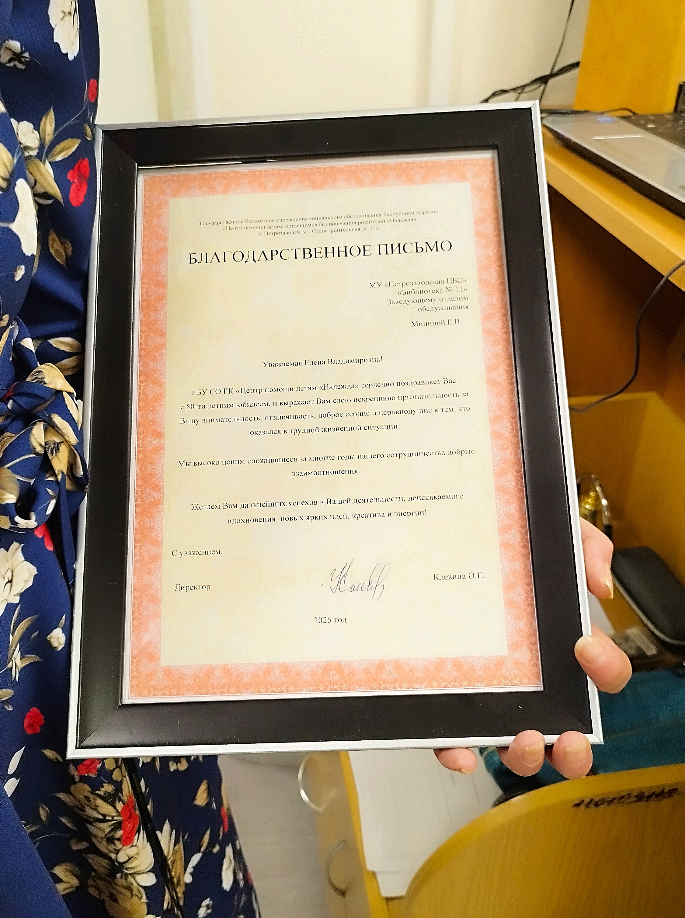 «Мы сотрудничаем с детским садом № 115, который находится на ул. Сегежской, а теперь ещё дальше они переехали в новое здание на той же улице. Я туда хожу и провожу мероприятия для детей, а библиотекарь Галина Лажиева проводит занятия для воспитателей. В 2025 году она подготовила для них обзоры журнала «Север». Другие детские сады мы приглашаем на мероприятия к нам в библиотеку. Договоры о сотрудничестве у нас заключены с шестью детскими садами: № 7, № 15, № 61, № 64, № 72 и № 115 – шесть детских садов. К нам приходит ещё детский сад № 90 (стали часто к нам проситься на мероприятия) и детский сад № 35. Скорее всего, в 2026 году мы с ними тоже заключим договор. Есть у нас тесное сотрудничество с Центром помощи детям «Надежда». Два года проводим мероприятия в Центре дневного пребывания для людей с особенностями здоровья «Сова». Ученики средней школы № 39 к нам приходят, а мы сами выходим на занятия в среднюю школу № 33. Мы когда заключаем договор с нашими социальными партнёрами, сразу составляем план мероприятий на календарный год», – рассказала Елена Минина, заведующий библиотекой.