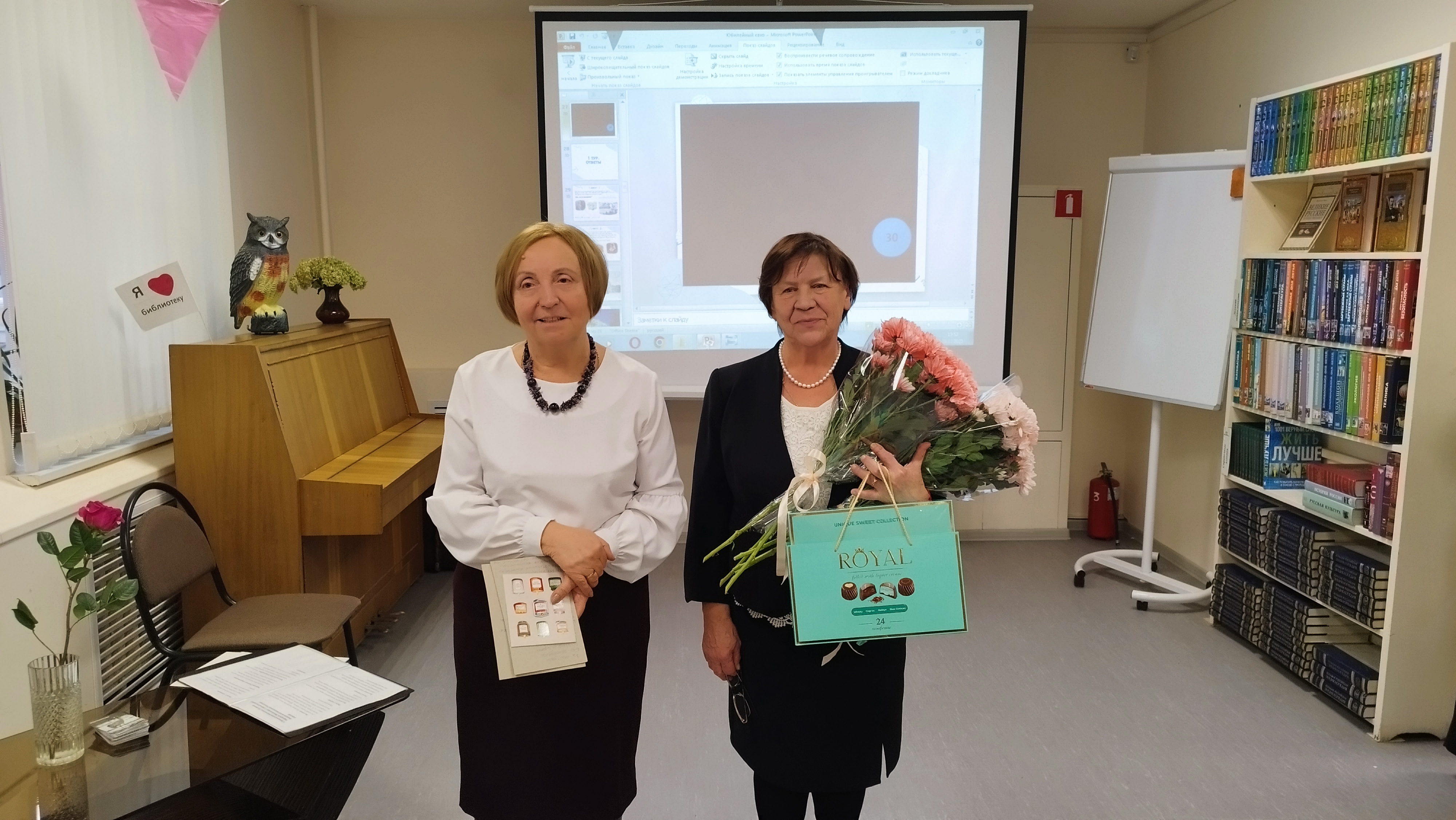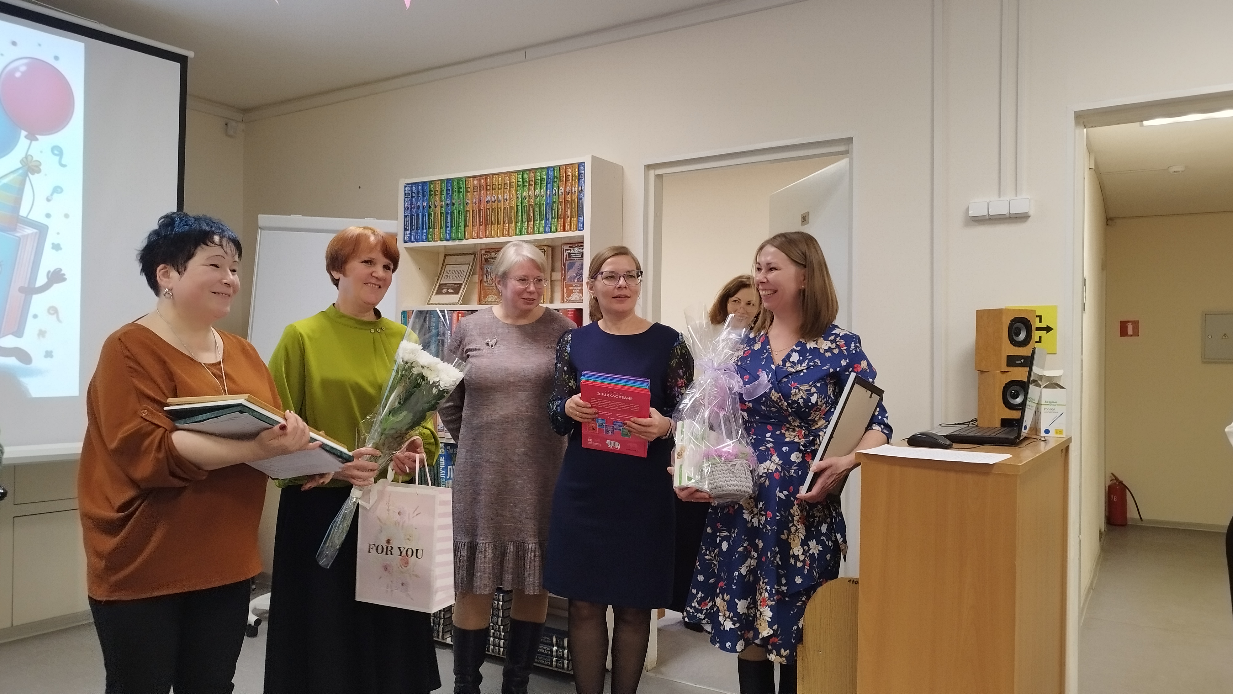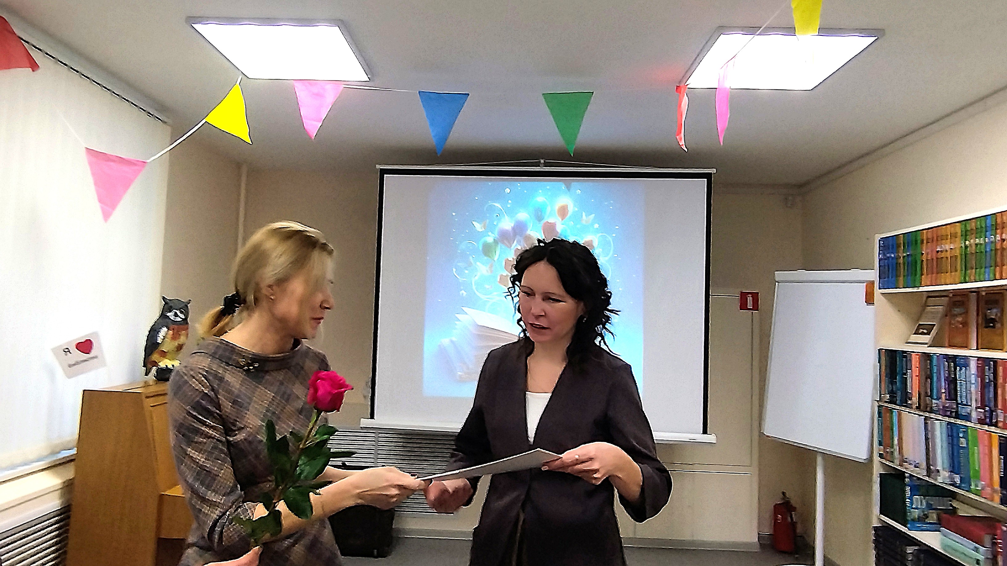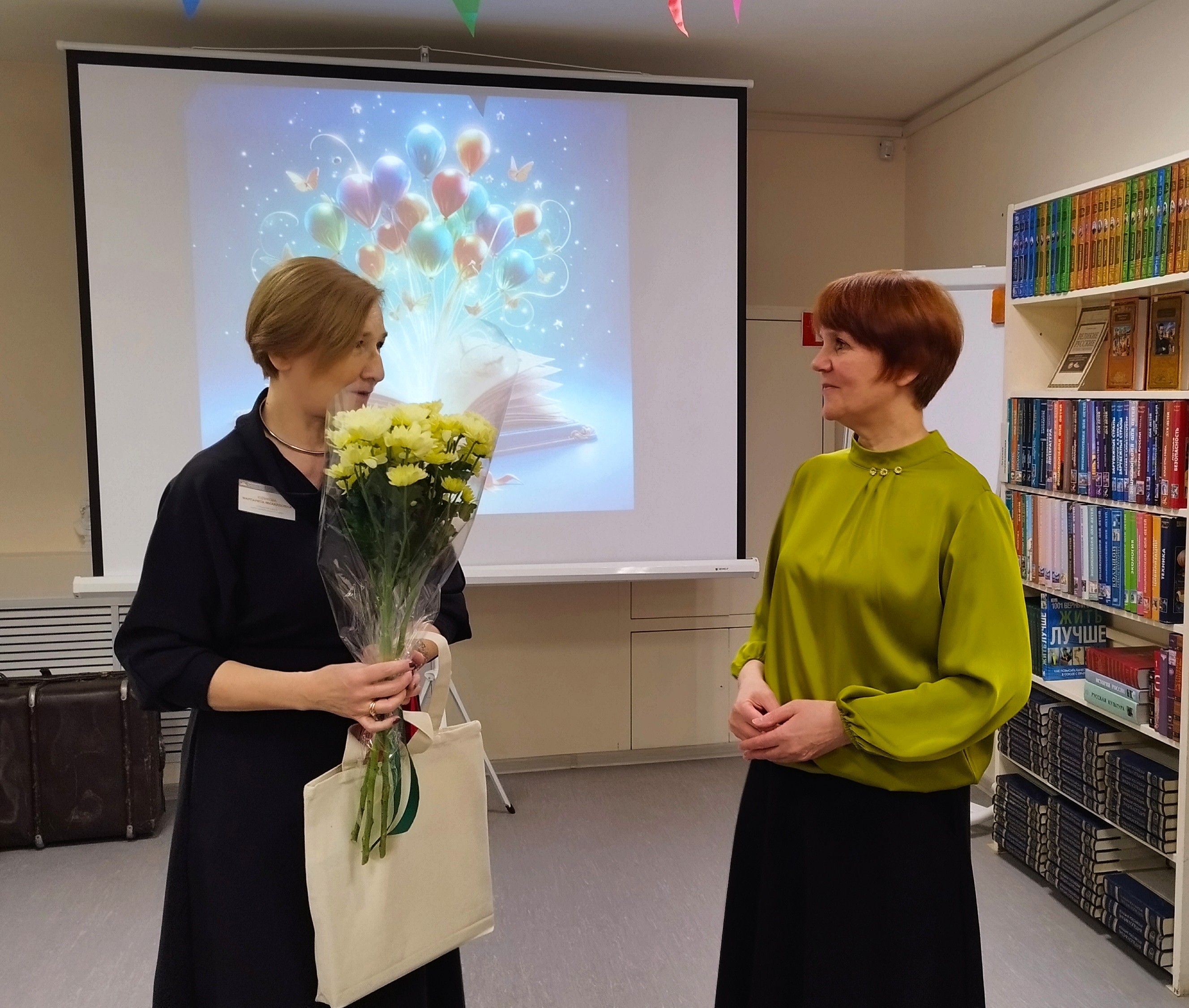 Мы были рады в такой важный день встрече с Маргаритой Куликовой, главным методистом отдела организации и методики библиотечной работы Национальной библиотеки Республики Карелия. Она поздравила юбиляров и вручила от имени Национальной библиотеки РК и Библиотечной ассоциации РК подарки.
