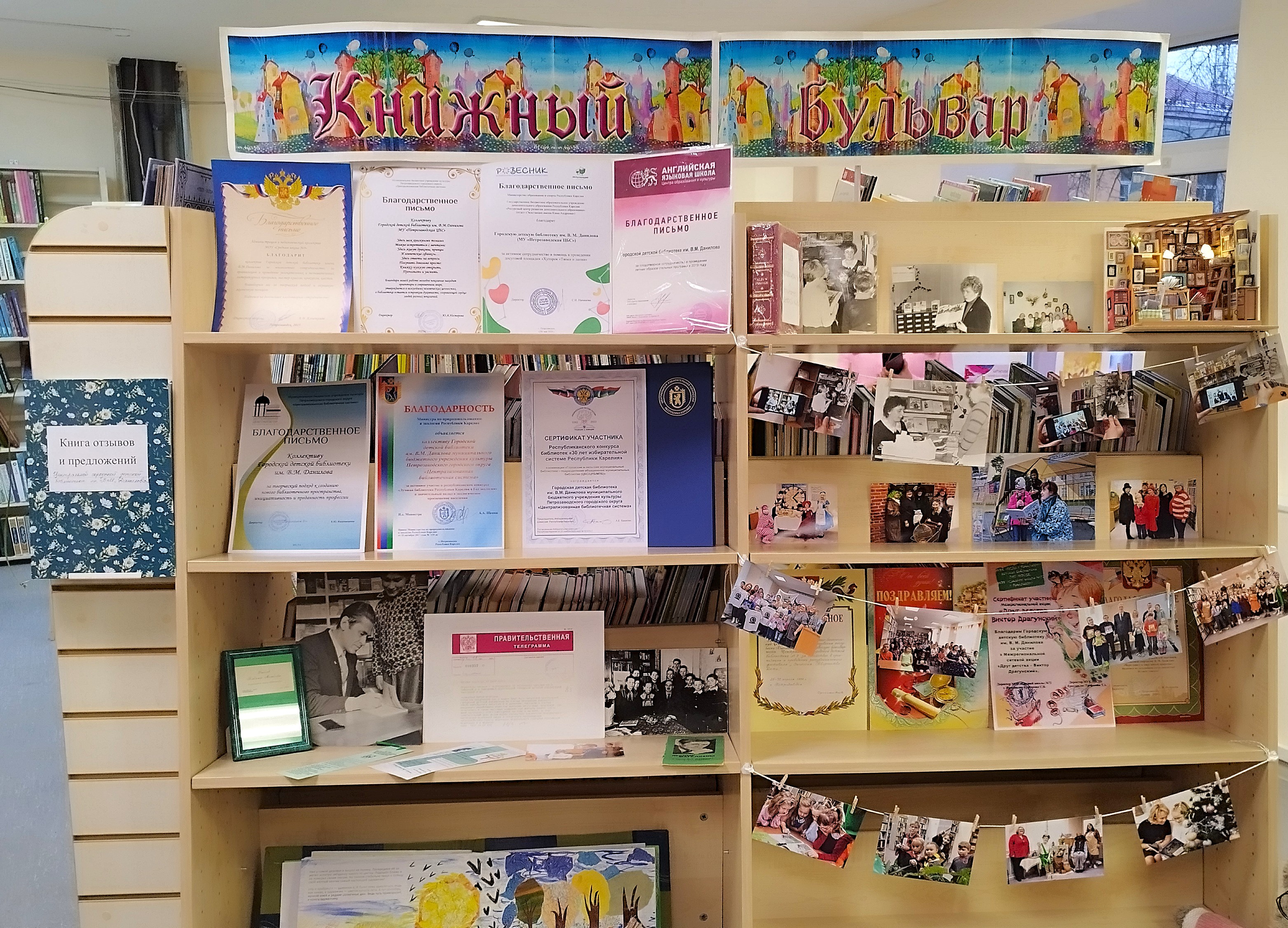 Центральное место на нём занимал стенд с благодарственными письмами в адрес коллектива ЦГДБ им. В. М. Данилова и архивными фотографиями. Мы бережно храним снимки людей, которые работали в библиотеке, и всегда с благодарностью их вспоминаем.
