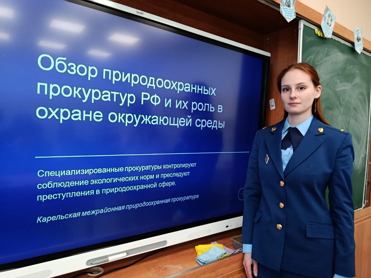 Мария Витальевна рассказала старшеклассникам о том, что Карельская межрайонная природоохранная прокуратура, образованная в 2008 году, выполняет функцию прокурорского надзора в экологической сфере - следит за выполнением природоохранного законодательства, подчиняется прокуратуре Республики Карелия и взаимодействует с федеральными надзорными органами. Природоохранная прокуратура контролирует соблюдение прав и свобод гражданина и человека, включая право на безопасную окружающую среду, достоверную информацию о ее состоянии.