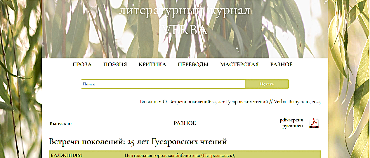 «Летопись» прошедших 25 Гусаровских чтений представлена в журнале «VERBA». Это издание рассчитано на всех интересующихся отечественной словесностью. Проект реализуется совместно с Союзом российских писателей по программе поддержки молодых авторов. На страницах юбилейного номера опубликована статья Ольги Балжиням, заведующего отделом обслуживания Центральной городской библиотеки им. Д, Я. Гусарова.
