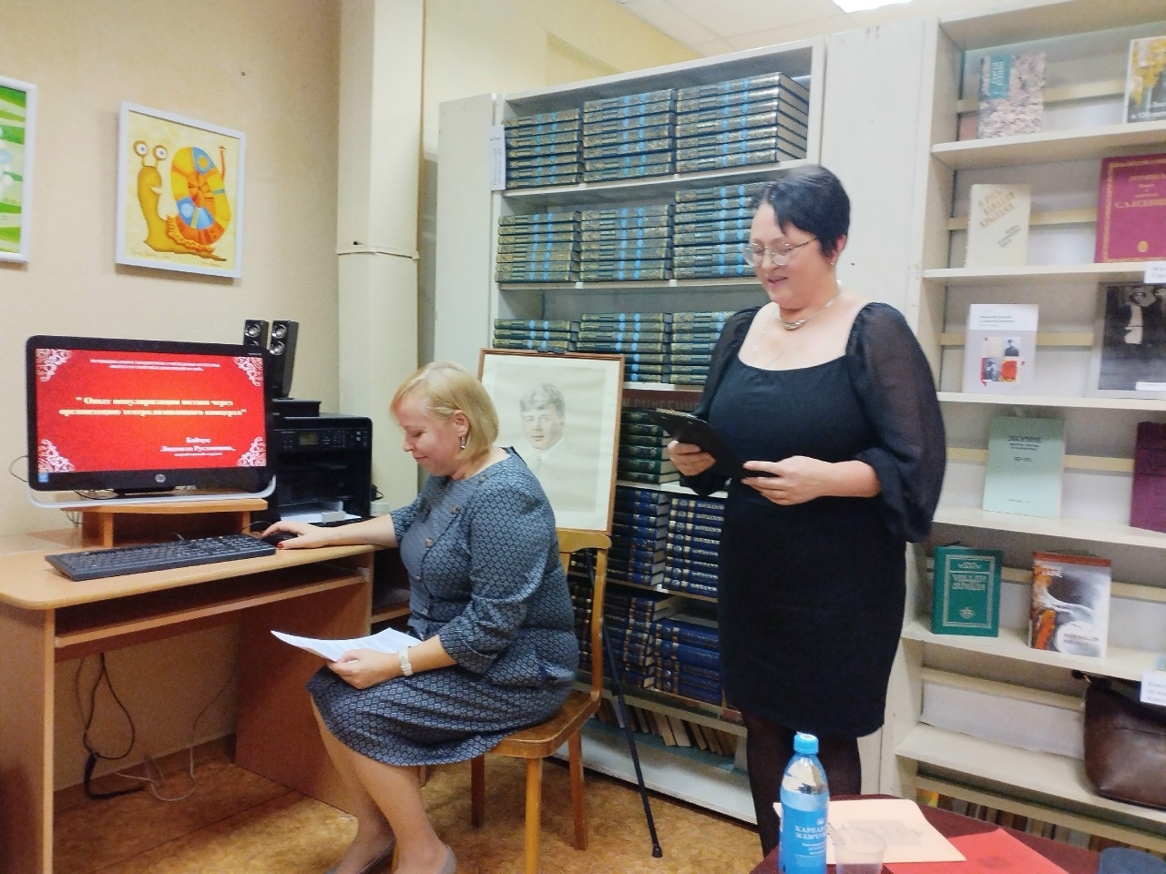 В исполнении А. Землянина прозвучала любимая многими песня «Не жалею, не зову, не плачу» (музыка Г. Пономаренко). Людмила Руслановна Бабчук, ведущий научный отрудник Вытегорского объединённого музея, поделилась своим опытом популяризации поэзии через театрализованный концерт, в котором воедино сплетаются музыка и пение, диалоги и монологи, танец и игровое действо. Значим визуальный ряд – костюмы, декорации! Вначале на экране были продемонстрированы сцены из прошлогоднего представления, посвящённого Николаю Клюеву, затем – сцены нынешнего Есенинского. Сценарий Людмила Бабчук писала вместе с Еленой Шинкарчук, с которой они вместе и выступали, и искали актёров. Есенина сыграл матрос, ни разу не стоявший на сцене. Айседору Дункан – сама Людмила Бабчук.